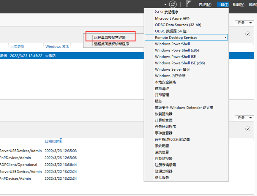 打开服务器管理,打开角色和功能,添加远程回话主机和远程桌面授权