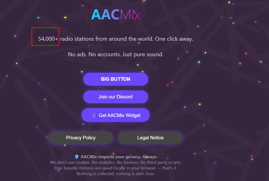 AACMix是一个完全免费的全球广播电台在线收听平台,汇聚超过54000个来自世界各地的在线电台,涵盖音乐、新闻、体育、文化等多元类型。无需注册登录,打开即用,且平台承诺无广告干扰、不使用cookies或第三方脚本,所有喜欢的电台信息均保存在本地浏览器中,为用户提供纯粹、安全、便捷的全球声音探索体验。