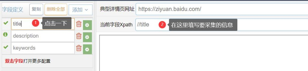 ②点击左边的description,填入://meta[@name=”description”]