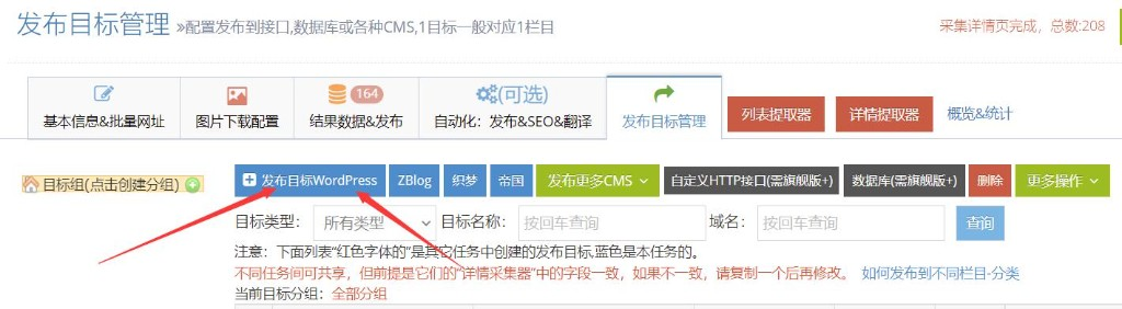 (1)添加发布目标。点击发布目标管理,点击【发布目标Wordpress】