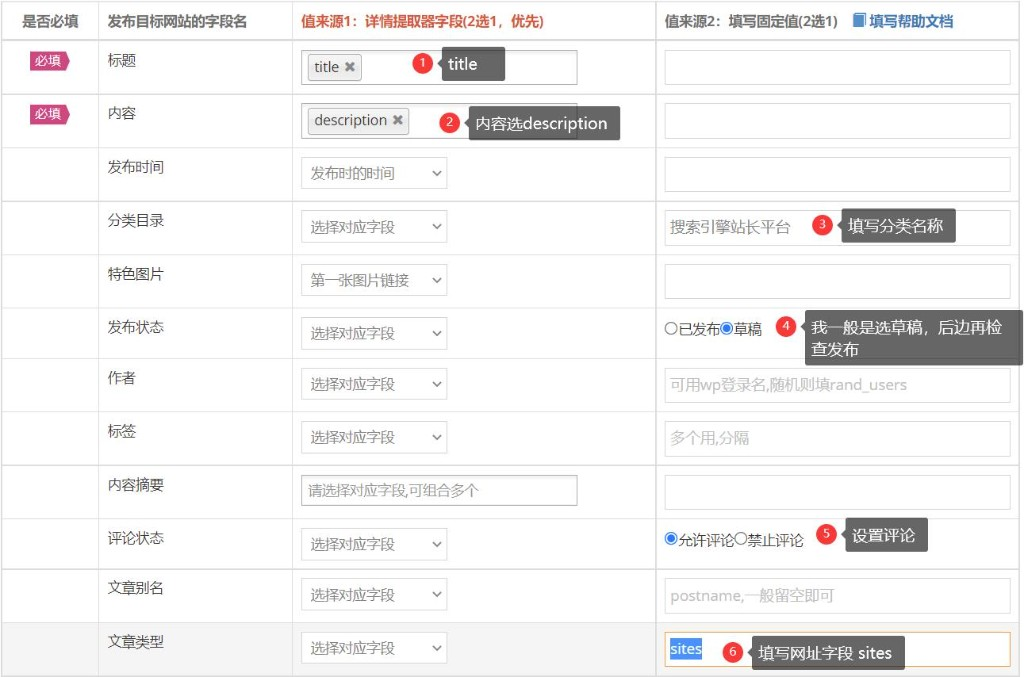 简数填写好名称、网站首页网址、发布插件密码在这一步中,设置发布的字段。要注意文章类型填写sites(对应oneNav主题的网址分类)