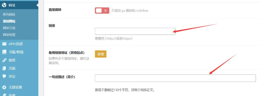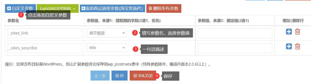 简数设置发布的字段最后,添加2个自定义参数,对应网址发布中的网站网址、一句话描述简数
