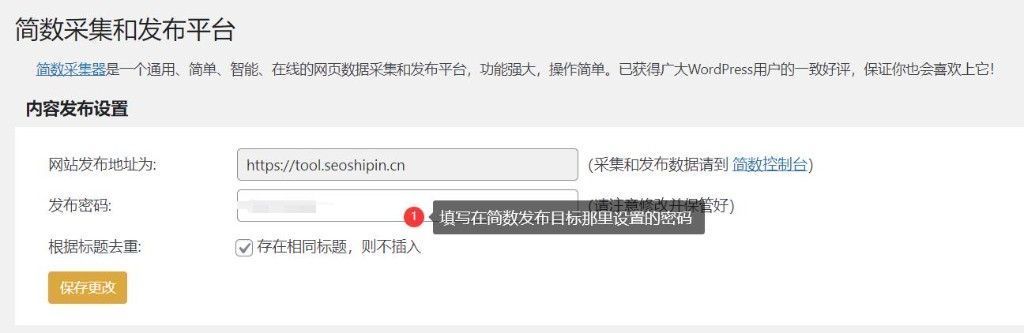 (3)设置插件。填写在第4步中简数发布目标设置的【发布插件密码】
