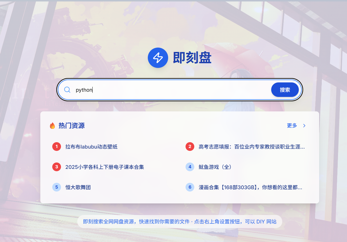 即刻盘是一款免费高效的网盘资源搜索工具,专注为用户提供快速、精准的网络资源检索服务。无论是学习资料、实用软件,还是影视娱乐、音频文档等各类文件,只需通过平台一键搜索,即可轻松获取海量网盘资源。其简洁直观的界面设计,结合智能搜索算法,大幅降低资源查找门槛,成为用户高效获取网络文件的必备工具。