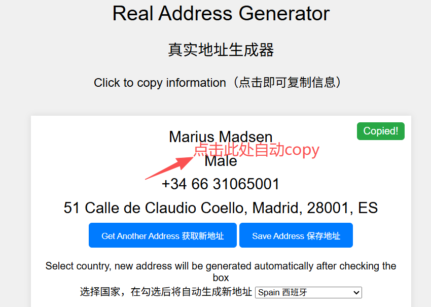 多国地址生成:支持全球多个国家和地区的地址生成,用户只需选择目标国家,即可获得该国风格的真实地址信息。